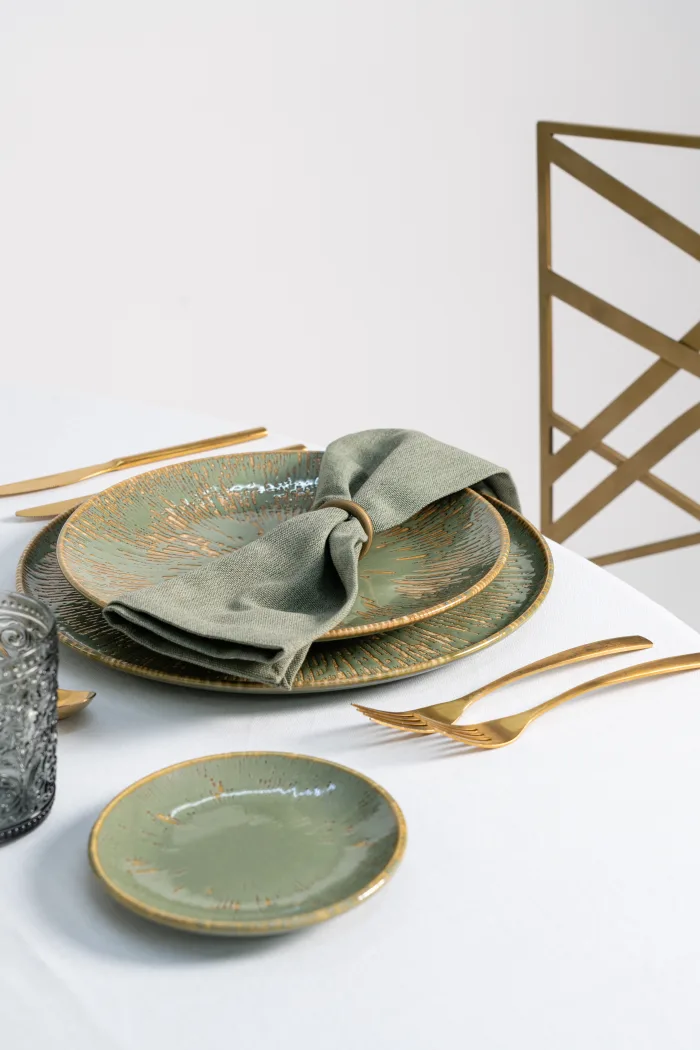 Nuestra linea de menaje barroco destaca por su diseño orgánico y texturas naturales, disponible en tonos verde y mostaza. Su acabado crea un efecto visual único, ideal para realzar la presentación de entradas, postres o aperitivos.