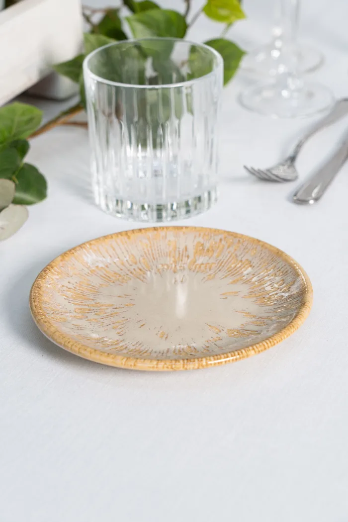 Nuestra linea de menaje barroco destaca por su diseño orgánico y texturas naturales, disponible en tonos beige y mostaza. Su acabado crea un efecto visual único, ideal para realzar la presentación de entradas, postres o aperitivos.