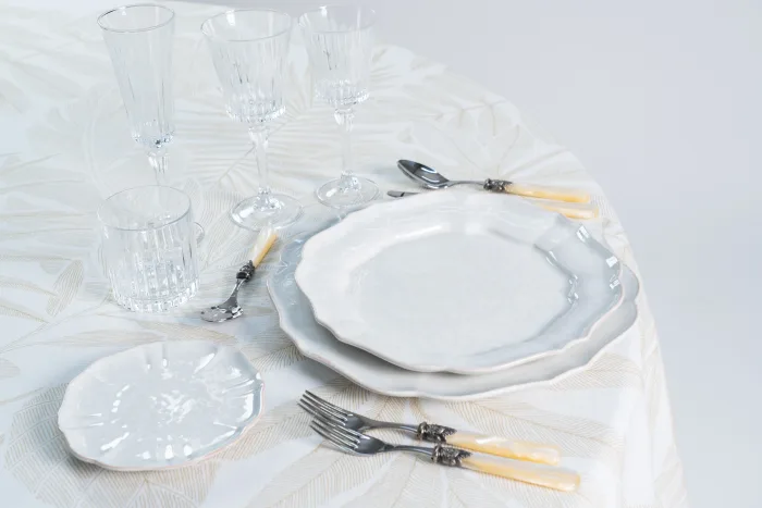 Este elegante plato de cerámica en tono crema con sutil acabado craquelado y borde ondulado es la elección ideal para bodas, cenas formales o celebraciones especiales, su diseño atemporal combina con una amplia variedad de estilos de vajilla y decoraciones.