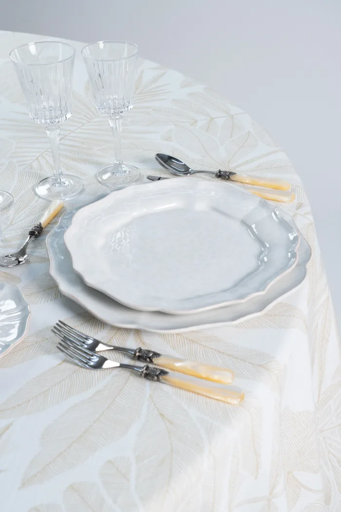 Este elegante plato de cerámica en tono crema con sutil acabado craquelado y borde ondulado es la elección ideal para bodas, cenas formales o celebraciones especiales, su diseño atemporal combina con una amplia variedad de estilos de vajilla y decoraciones.